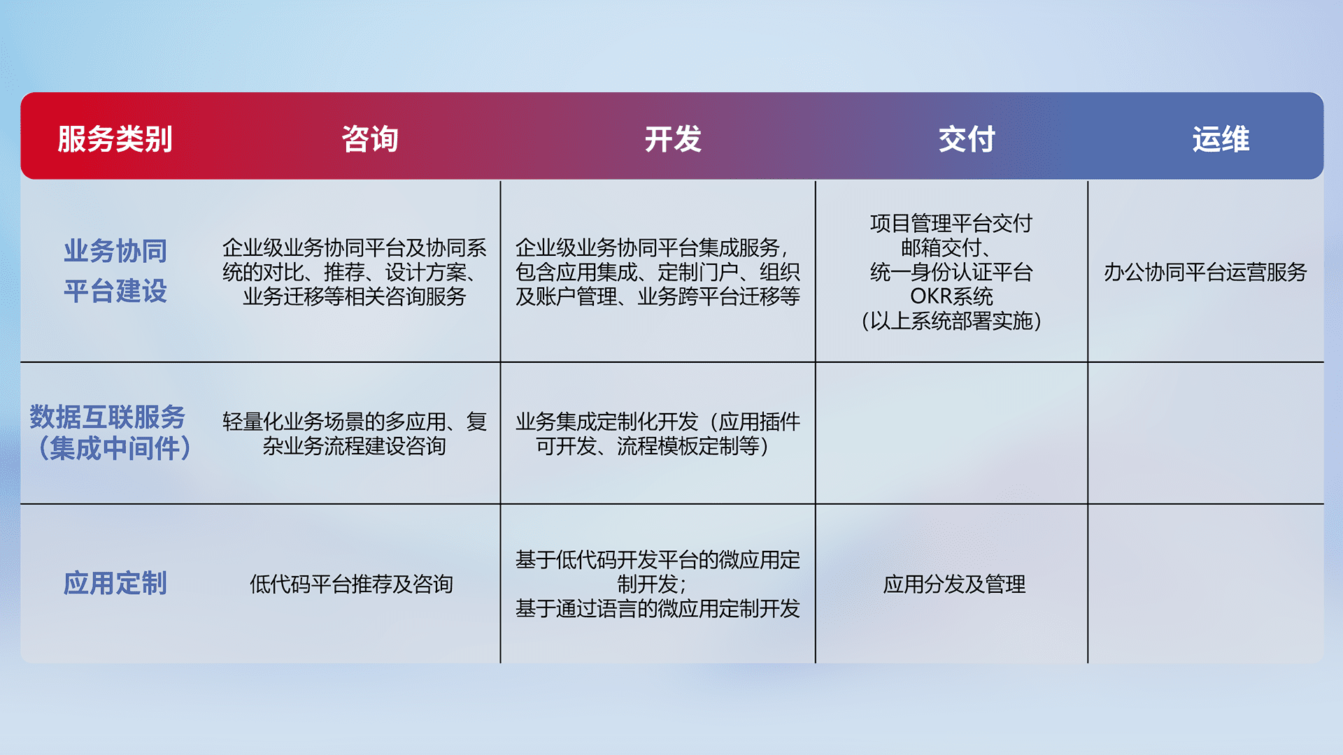 针对钉钉、、、企微、、IDaas等平台级产品提供产品的规划、、方案、、、、交付、、、定制化开发等服务,,实现如统一协同办公、、智能客户服务、、、混合会议管理、、、、智能数据查询、、、、等业务场景,,,,实现数字化转型。。。